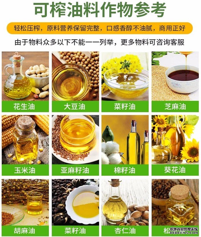 該設備可適用于菜籽、花生、茶籽、大豆、核桃、葵花籽等油料的生產加工,且壓榨出的油品綠色環保,對人體健康有益無害。購買此機后可長期穩定作業,對于中、小油廠和鄉鎮個體企業都很適用。